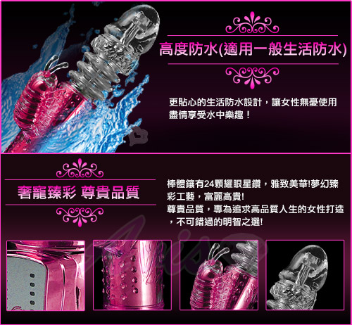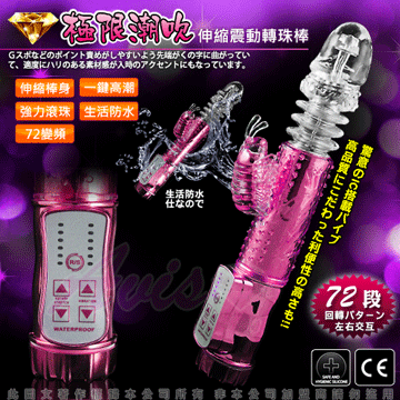 最新強力電動伸縮按摩棒,可同時震動陰道、陰核,震動力強勁!耐用、耐操,同時可震動,遠遠超越了男性陽具所能發揮的體能極限,強烈的戳幹力,幾乎讓人無法一手掌握,再怎麼強烈的燎原慾火,也會被它所撲滅夷平。中間的環紋部分不停地伸縮、抽動,在您的私處進出、摩擦;小蝴蝶的拍打、添吸著您最敏感的陰蒂……