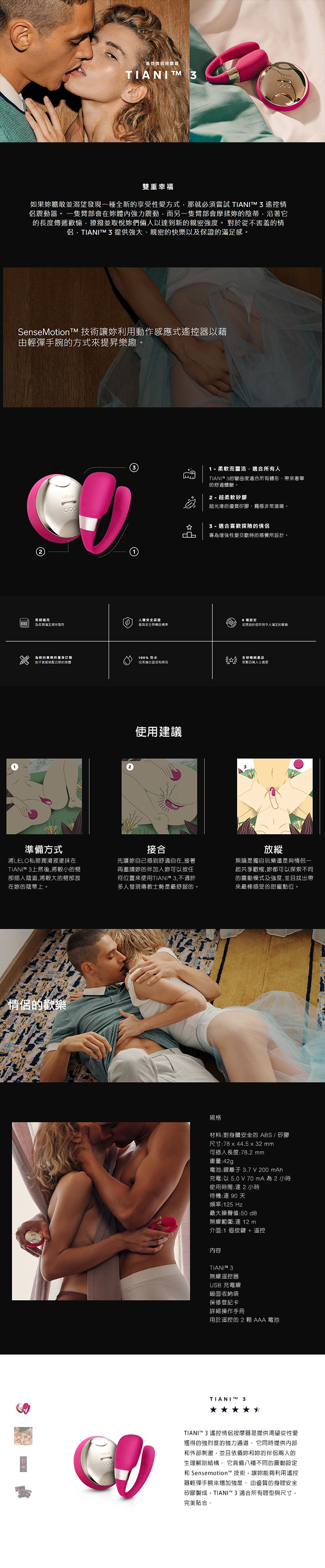 完全防水設計,可反复充電,擁有遙控功能,蒂阿妮3是LELO最經典的設計之一,讓您與愛人共同抵達性愛之巔。