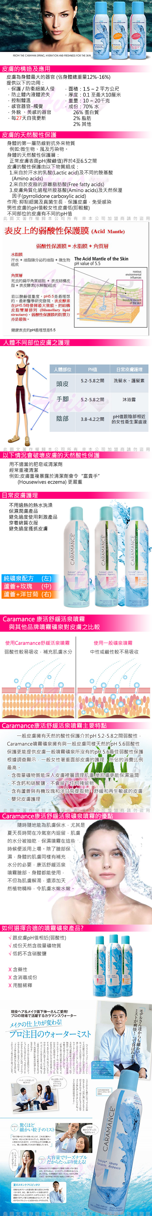 法國Caramance 康活舒緩活泉噴霧,取自法國Alta Lnmuedoc自然公園地區,從地底910公尺抽出純淨無汙染之天然活礦泉水。含豐富的微量礦物質能深入皮膚調理肌膚,使肌膚更能保濕滋潤,更添加蘆薈及洋甘菊天然植物精粹。