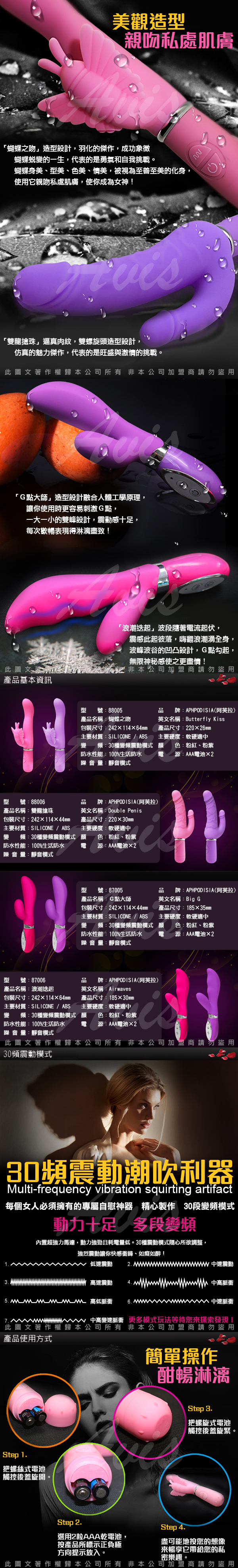 .主商品:APHRODISIA 蝴蝶之吻 30段變頻 雙叉G點 震動按摩棒 紫 *1