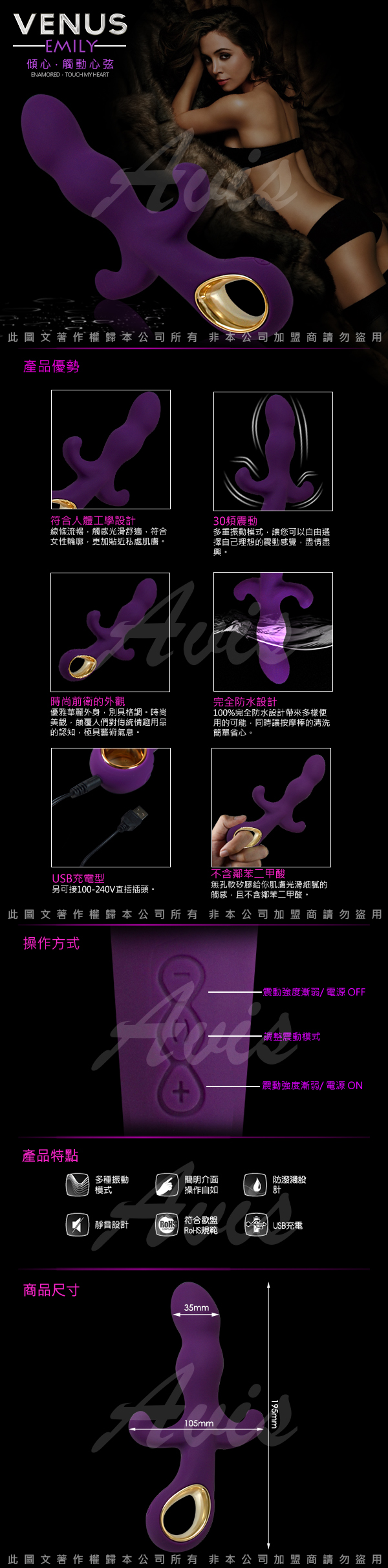 .主商品:艾蜜莉 多功能 30頻 時尚精品 三點式刺激按摩棒 魅紫 *1