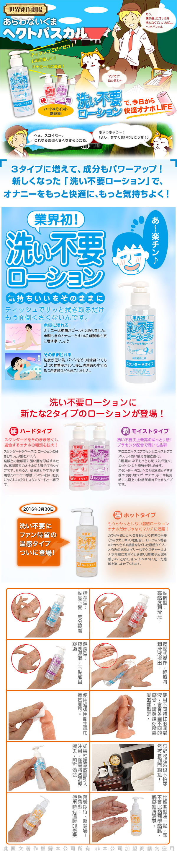 用完潤滑液和自慰套自爽後往往讓人想休息片刻(甚至想直接睡著)實在懶得再爬起身到浴室清洗擦拭。如果放任不去清洗往往會造成皮膚黏癢的衛生問題!現在您不用再煩惱這個問題了!超便利的免清洗潤滑液誕生囉!