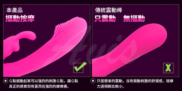 有別於一般按摩棒設計,是專為剌激女性G點高潮,開發女性潮吹專用的按摩棒, 最特別就是在棒身頭部的地方,是設計上下往複式蠕動,就像是手指上下摳動一樣,只要使用按摩棒插入陰道後,找到女性G點所在位置,用頭部頂住後,只要開啟蠕動模式,就可直接針對G點部位進行最強烈的剌激,再啟動震動模式,雙重剌激下,保證可在最快時間內讓女性達到高潮潮吹境界。