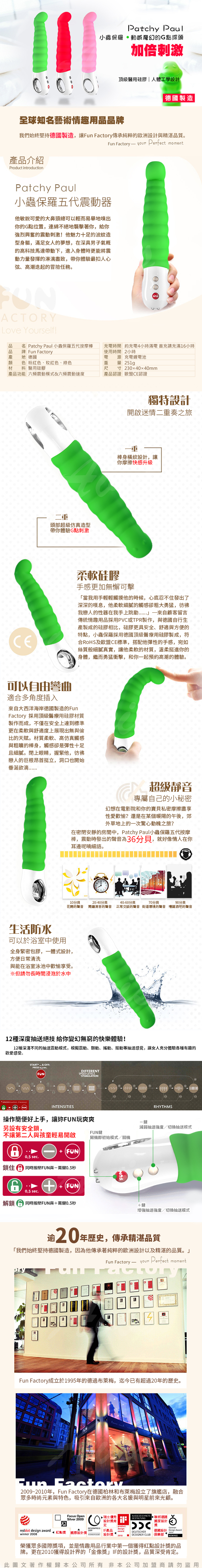 第五代時尚奢華按摩棒使用獨家專利的FlexiFUN柔軟彈性矽膠材料技術,製成特別柔軟彈性的主體,獨特地可以適應任何女性內部身體結構、動作和外部的敏感帶。新一代精準馬達力學設計,可以直接將強烈的振動波傳遞到整個玩具主體,連最頂端也是強勁有力,甚至達到你最隱密的敏感帶激情點,強度提高25%。它有著令人愉悅且狂野的力量,總共6種振動節奏和6個振動強度,將帶來感官一波波的狂喜。它的遊戲是多樣多變化的。加上旅行鑰匙鎖,意味著它可以離開家,在手提包或行李箱裡跟著你秘密地旅行世界。它喜歡在海灘上的假期,所以是完全防水的,與你在水中一起遊戲。因為它可靠又善體人意地知道每個女人想要什麼,所以它一次又一次地,在一波波高潮上衝浪!