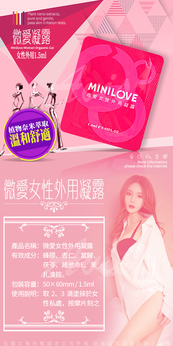 .主商品:MINILOVE 女用高潮助情液 女性情趣提升凝露 女用快感提升液 1.5ml x10包
