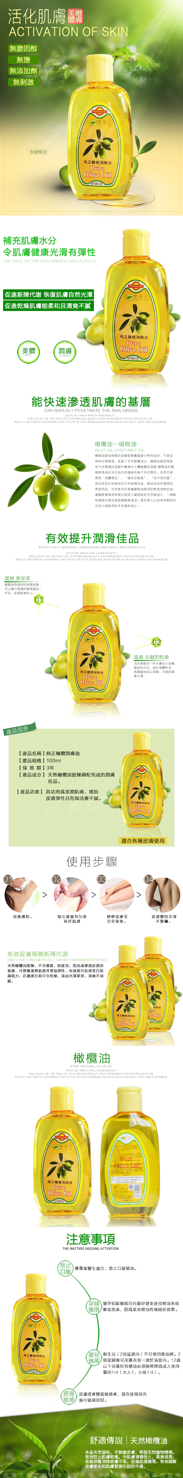 橄欖油俗稱"美人油",純精製極品植物油,不含任何膽固醇,不飽和脂肪酸低於1.4%, 豐富的滋養成份,可充分滋潤肌膚。