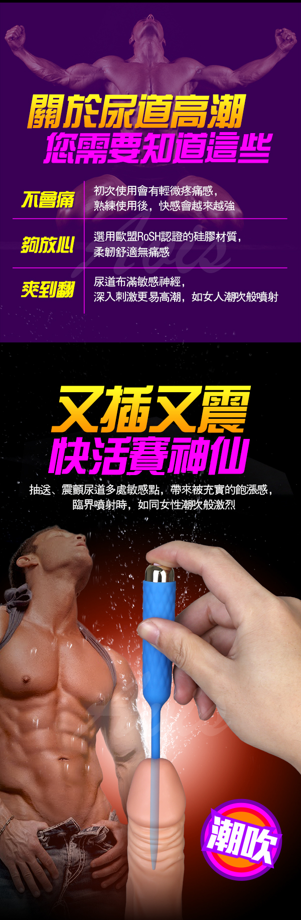 探索尿道刺激器攪弄尿道男人也會潮吹!此款採用軟體矽膠輕柔不怕受傷!刺激尿道,酥麻快感循環襲擊,使高潮在臨界點邊緣徘徊,直到汁液噴射,比女性潮吹來要猛烈。3速7頻高頻震動又插又震的使您快活似神仙!震顫尿道多處敏感點,帶來被充實的飽漲感