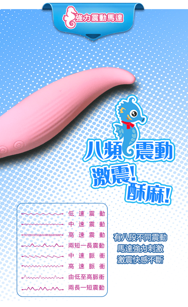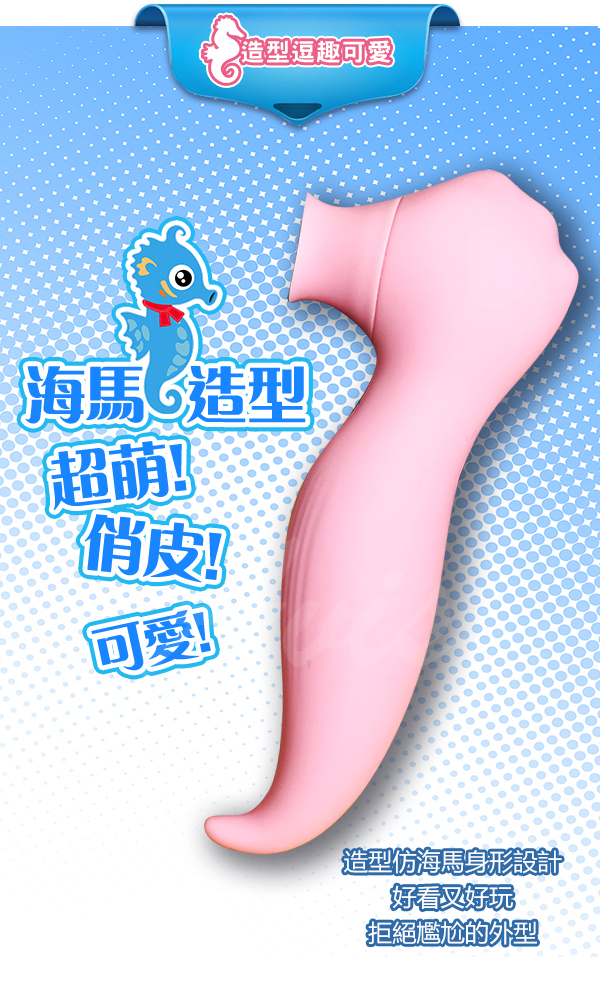 根據研究發現女性性高潮主要分為陰蒂高潮和G點高潮,然而性生活中女性很少能體驗到陰蒂高潮帶來的快感。為了解決女性的這種痛點,根據海馬吮吸的進食習性和獨特小巧精緻的外形,並結合人體工程學、美學,從而設計出此款可吮吸的8震+3吸震動棒。產品依潮流的使用馬卡龍色系,吮吸與震動的雙重功能,獨特的外形,給您帶來美與陰蒂的高潮。