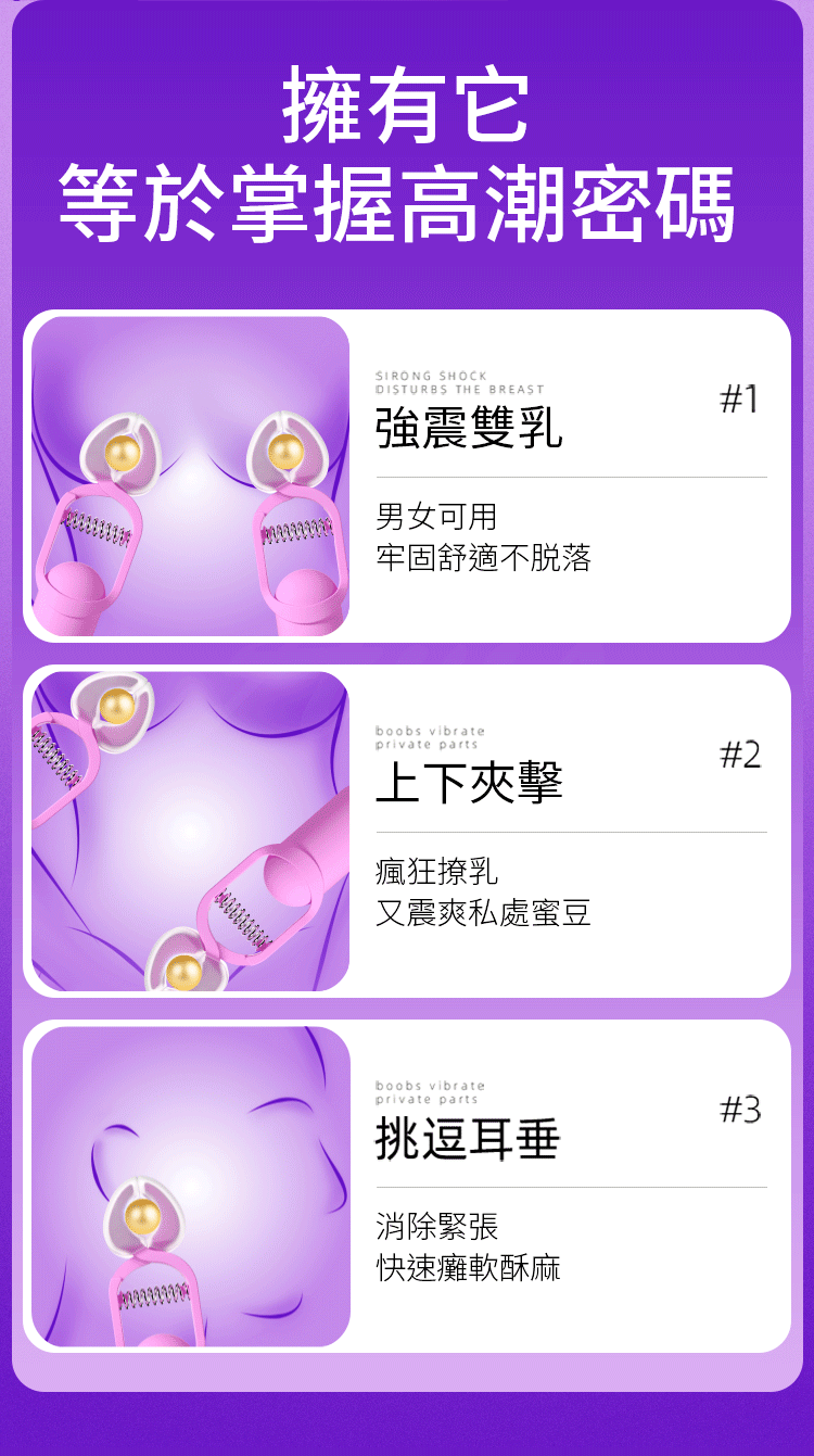 男女可用牢固舒適不脫落,消除緊張快速癱軟酥麻。注重前戲讓性,與愛融為一體,夾震撩乳像牙齒輕咬,強震激爽心神蕩漾。