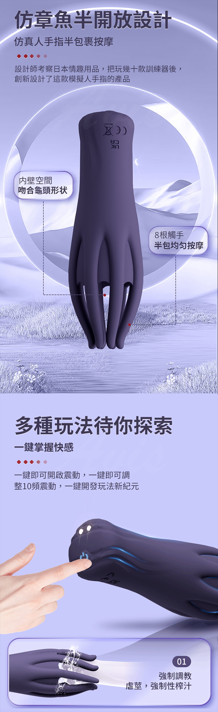 是一款專為進階玩家設計的震動鍛鍊器,結合獨特的 8爪觸角 與 10頻強震模式,帶來極致刺激與鍛鍊效果。