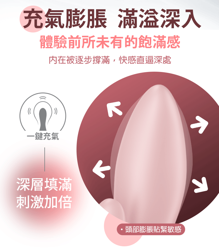 輕按按鍵,頭部逐漸膨脹,貼合敏感區域,由內而外滿滿包覆。
